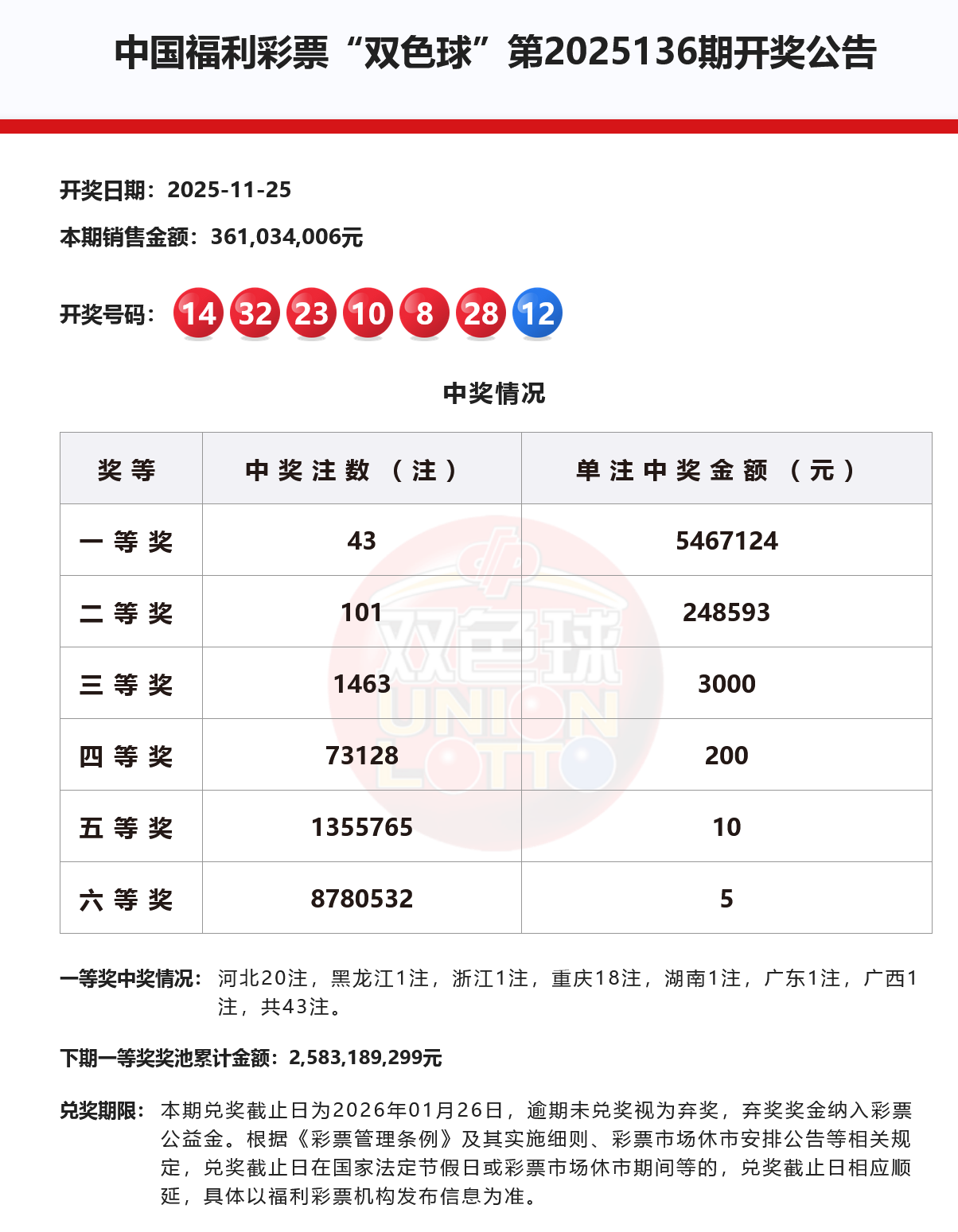 大皖新闻讯 中国福利彩票“双色球”第2025136期中奖号码为:红球:8、10、14、23、28、32;蓝球:12股票配资官方。