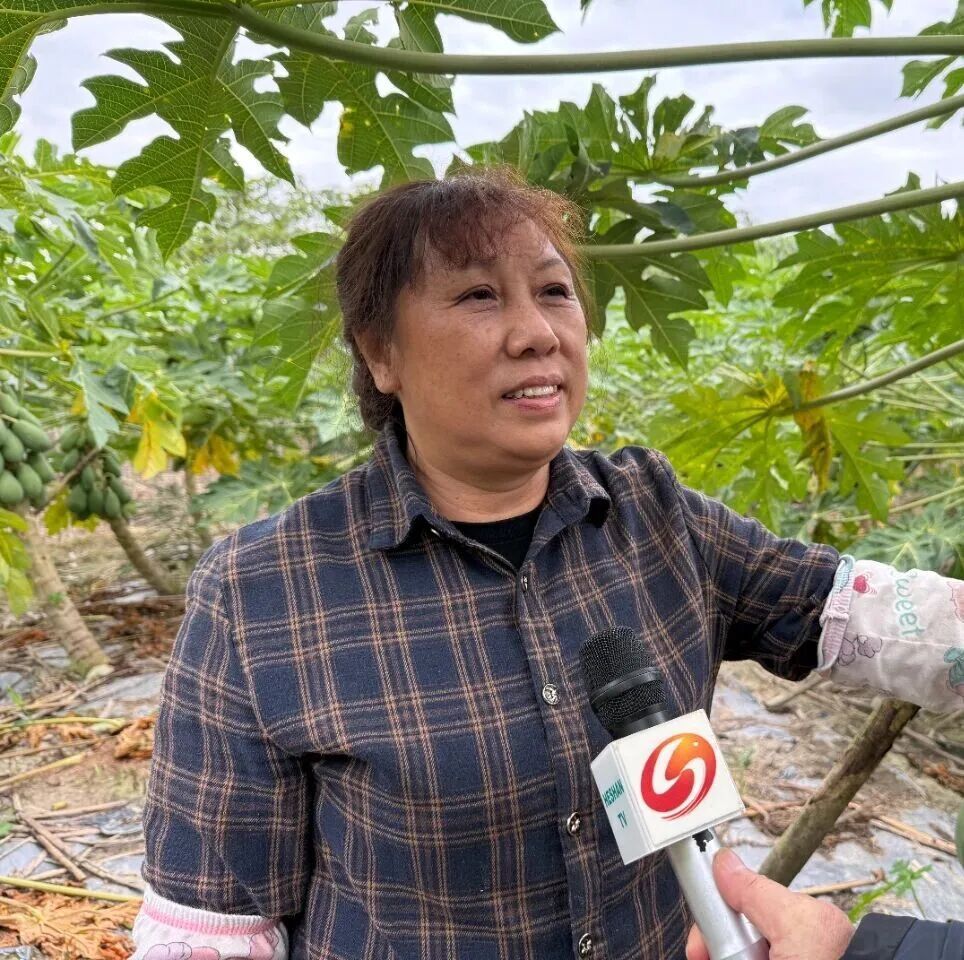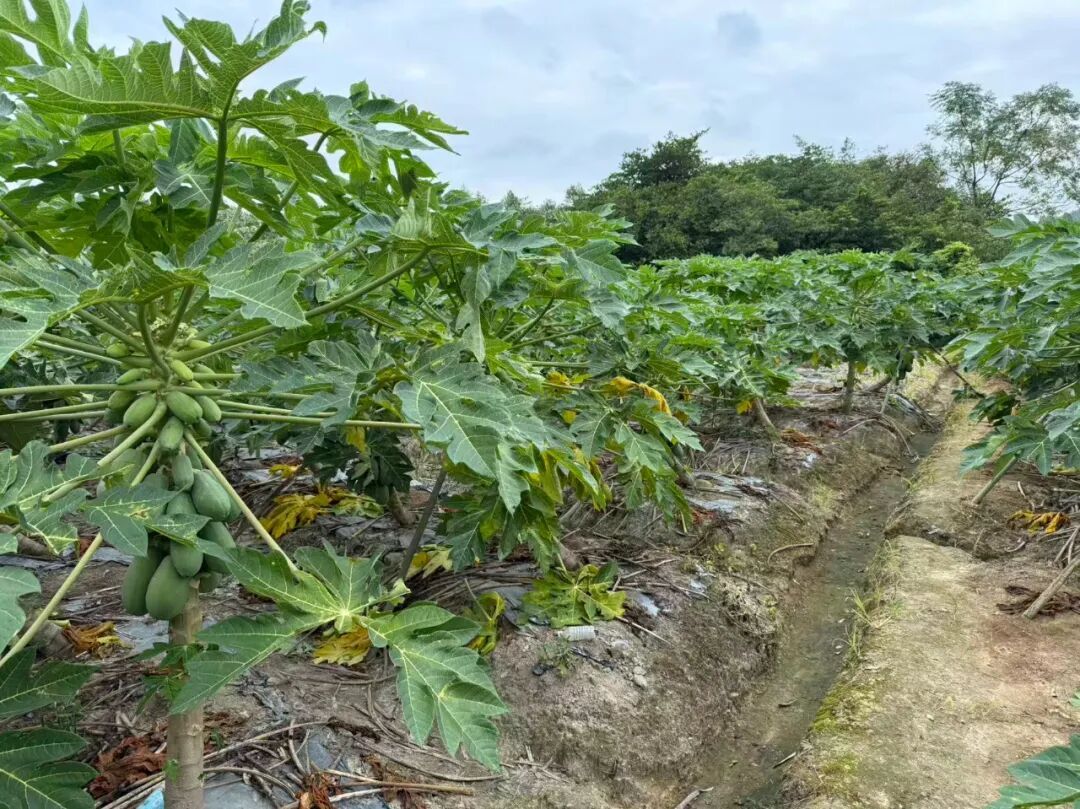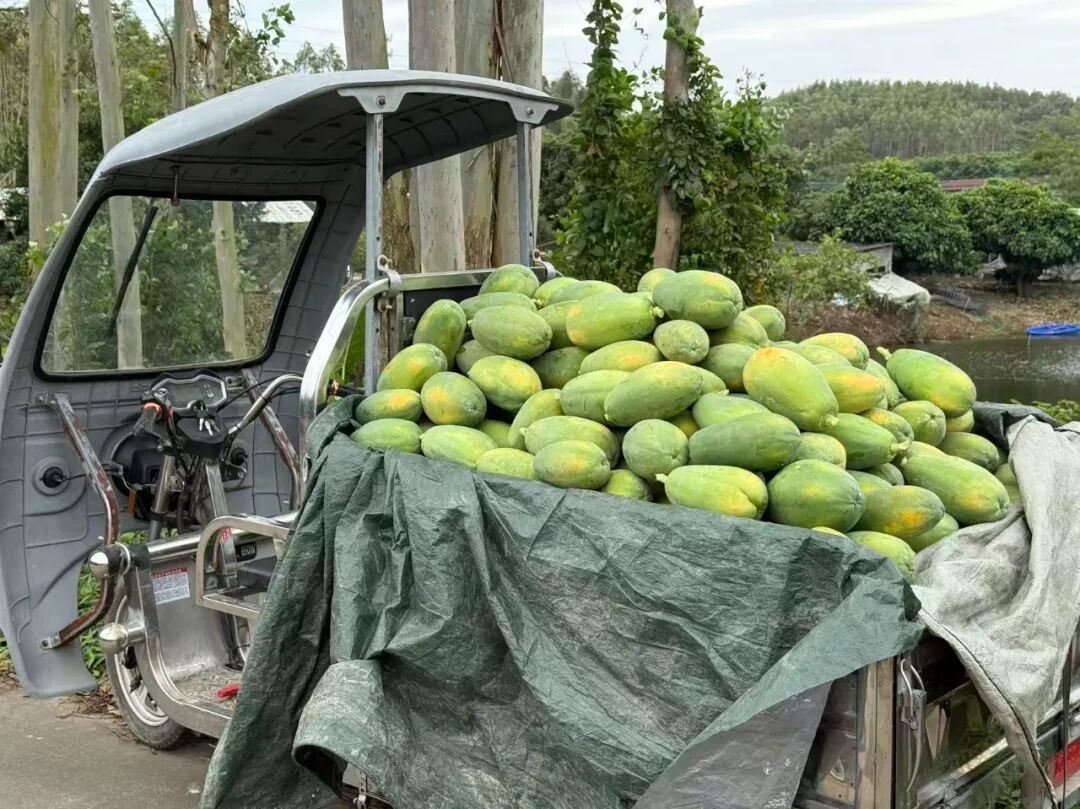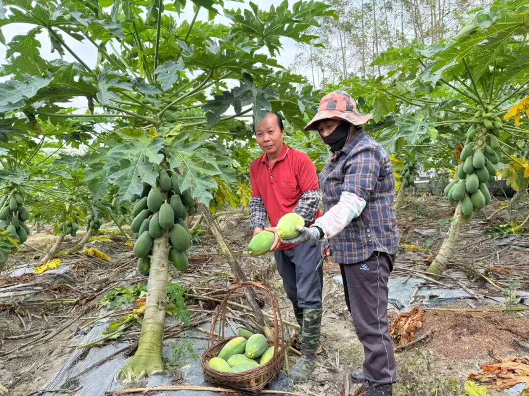 10月末,在鹤山市宅梧镇榴花坪村,农户余大姐的木瓜种植基地一派丰收景象,一串串饱满的木瓜从树干基部一直挂到梢头,空气中弥漫着清甜的果香。